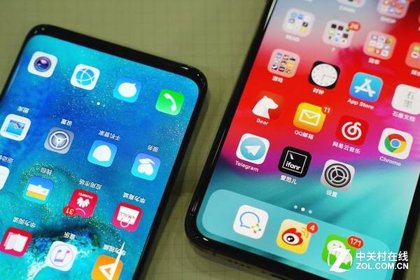 外观上来说,华为Mate 20 Pro与iPhone XS都采用了刘海屏的设计,不过从两款手机的直接观感上来看,iPhone XS的边框宽度似乎更加均匀一些。当然,在整体边框也更加宽一些,这点发布会的PPT上已经体现过了。