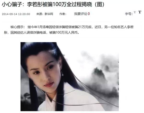 单在2014年,汤唯和“小龙女”李若彤就先后被电信诈骗了21万和100万。