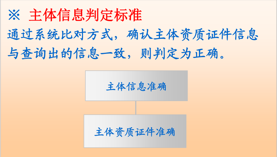 通过系统比对,确认主体名称和证件号码与查询出的信息一致,则判定正确。